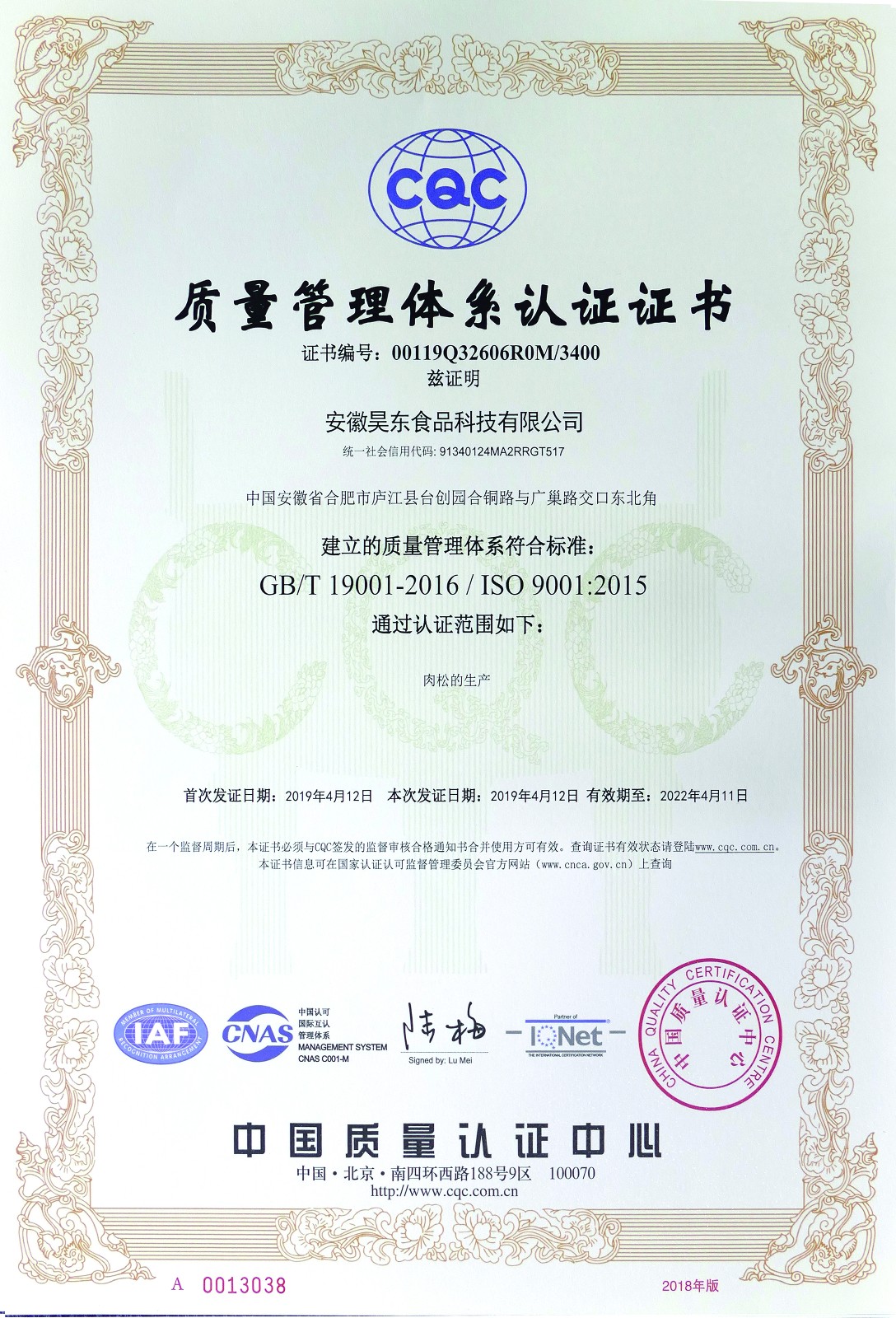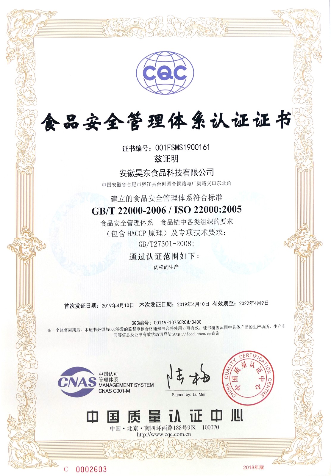 食品安全管理體系認(rèn)證證書