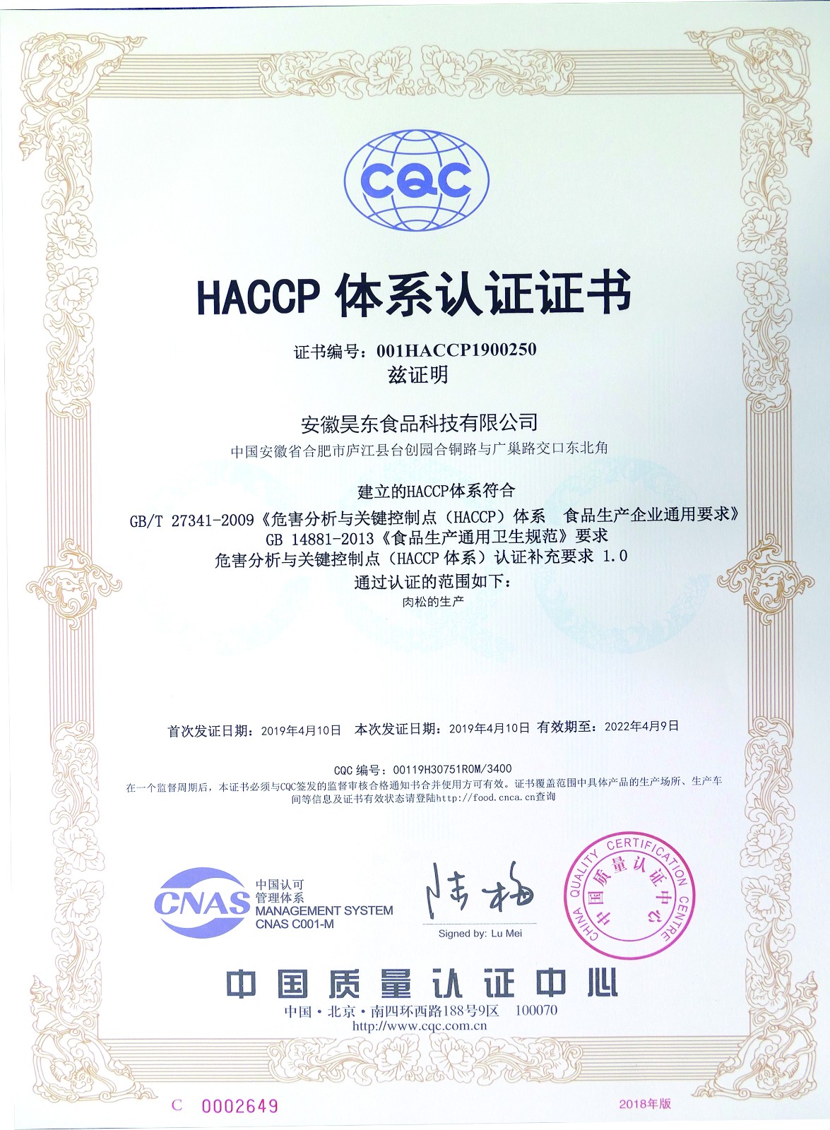 HACCP體系認(rèn)證證書