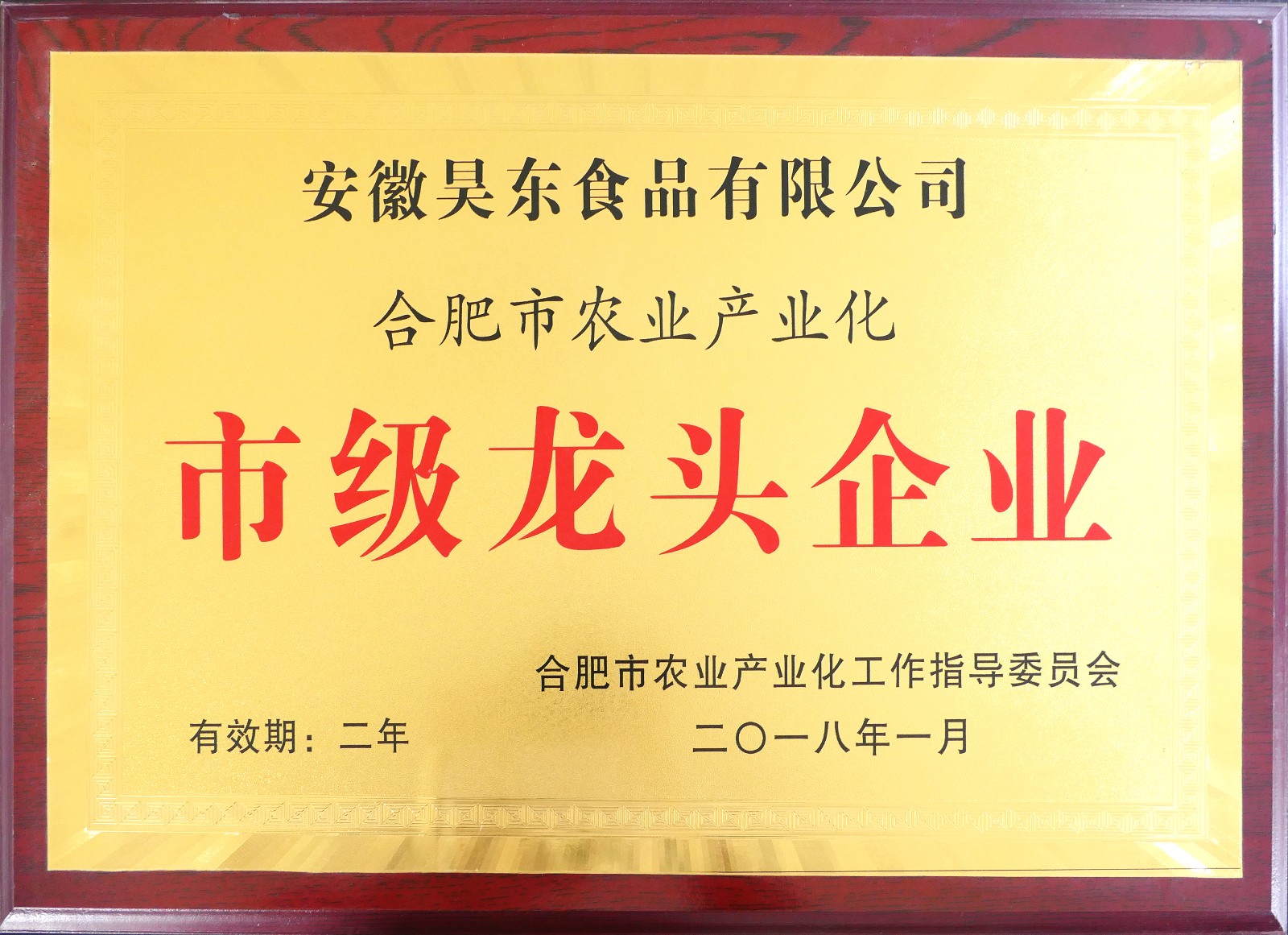 昊東食品市級龍頭企業(yè)證書