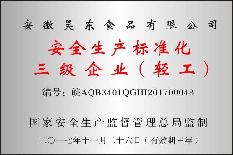 • 昊東食品三級企業(yè)證書